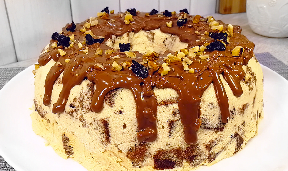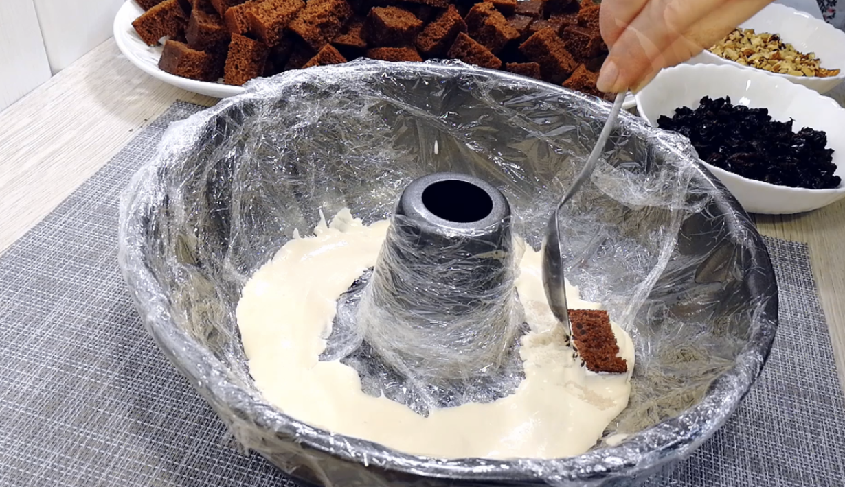 У форму для кексу, застелену плівкою, викладайте шарами: крем, шматочки бісквіта, горіхи й чорнослив. Повторюйте, поки не використаєте всі компоненти. Затягніть плівкою і залиште в холодильнику на ніч.
