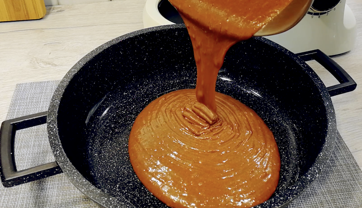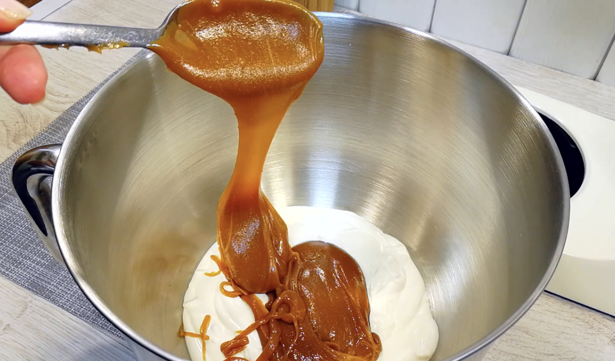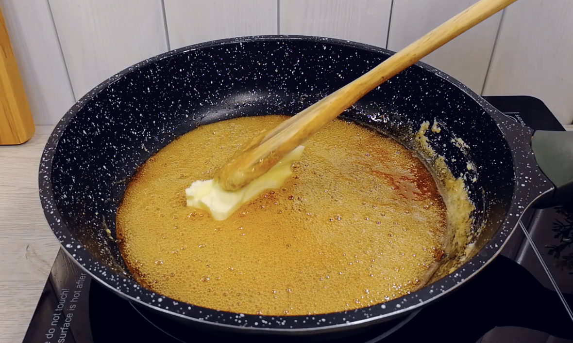 Приготуємо карамель: розтопіть цукор з водою на середньому вогні без перемішування. Коли маса стане янтарного кольору, обережно додайте масло, потім сметану. Перемішайте до однорідної консистенції. Остудіть.