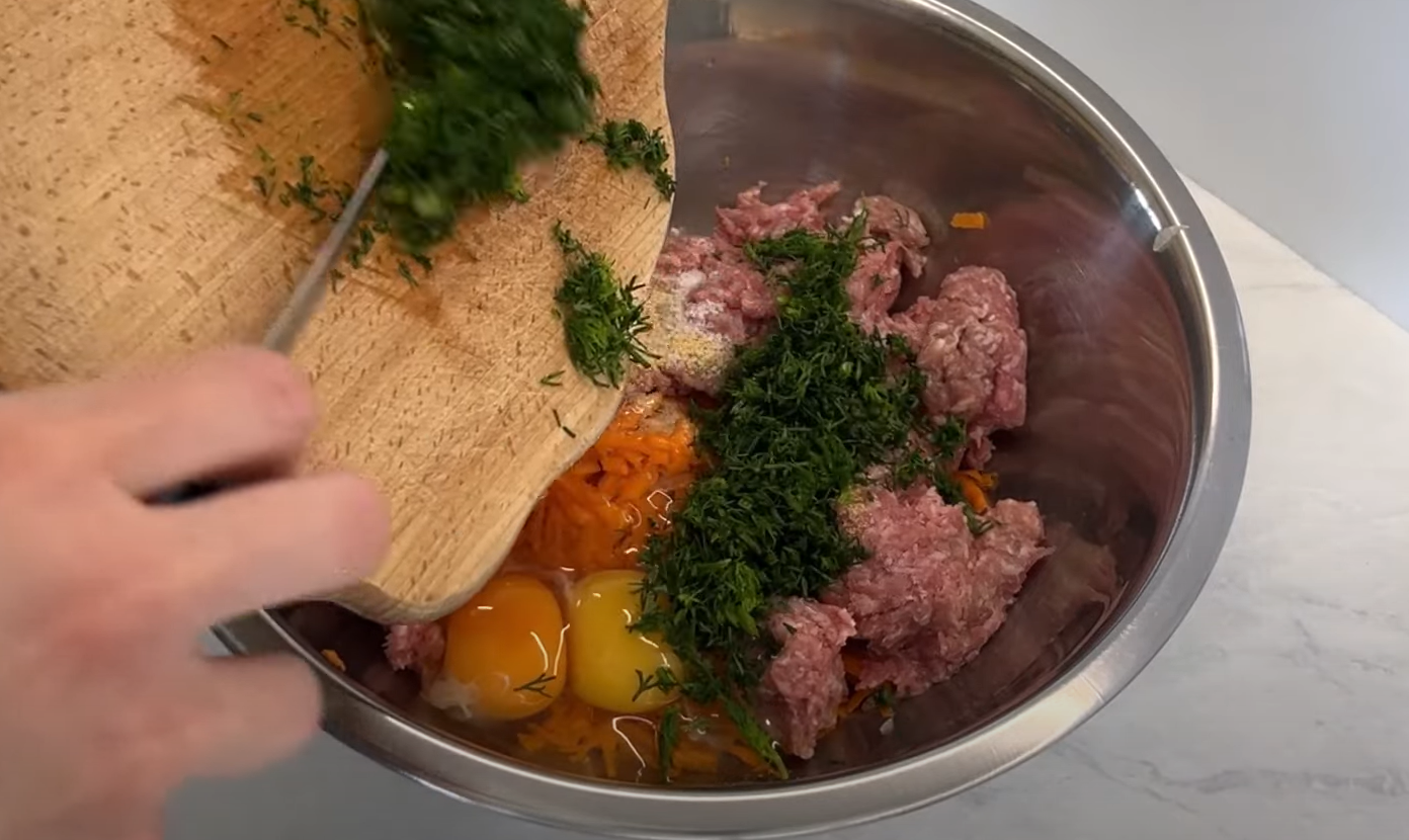 Моркву й цибулю також натираємо на великій тертці. Додаємо фарш, сушений часник, 1 ч. л. солі, перець, яйця та подрібнений кріп.