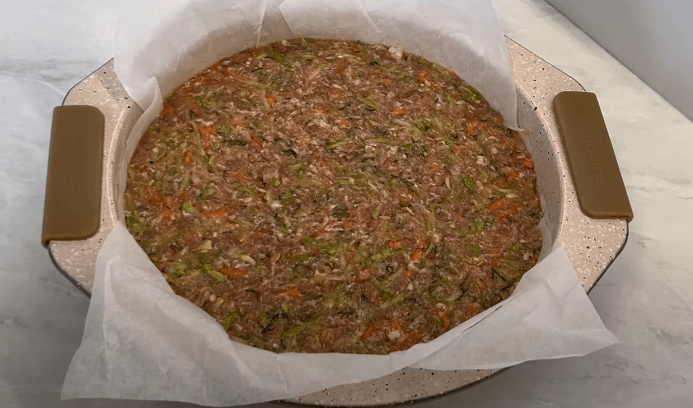 Форму застеліть пергаментом і змастіть олією. Викладіть підготовлену суміш і рівномірно розподіліть її по формі.