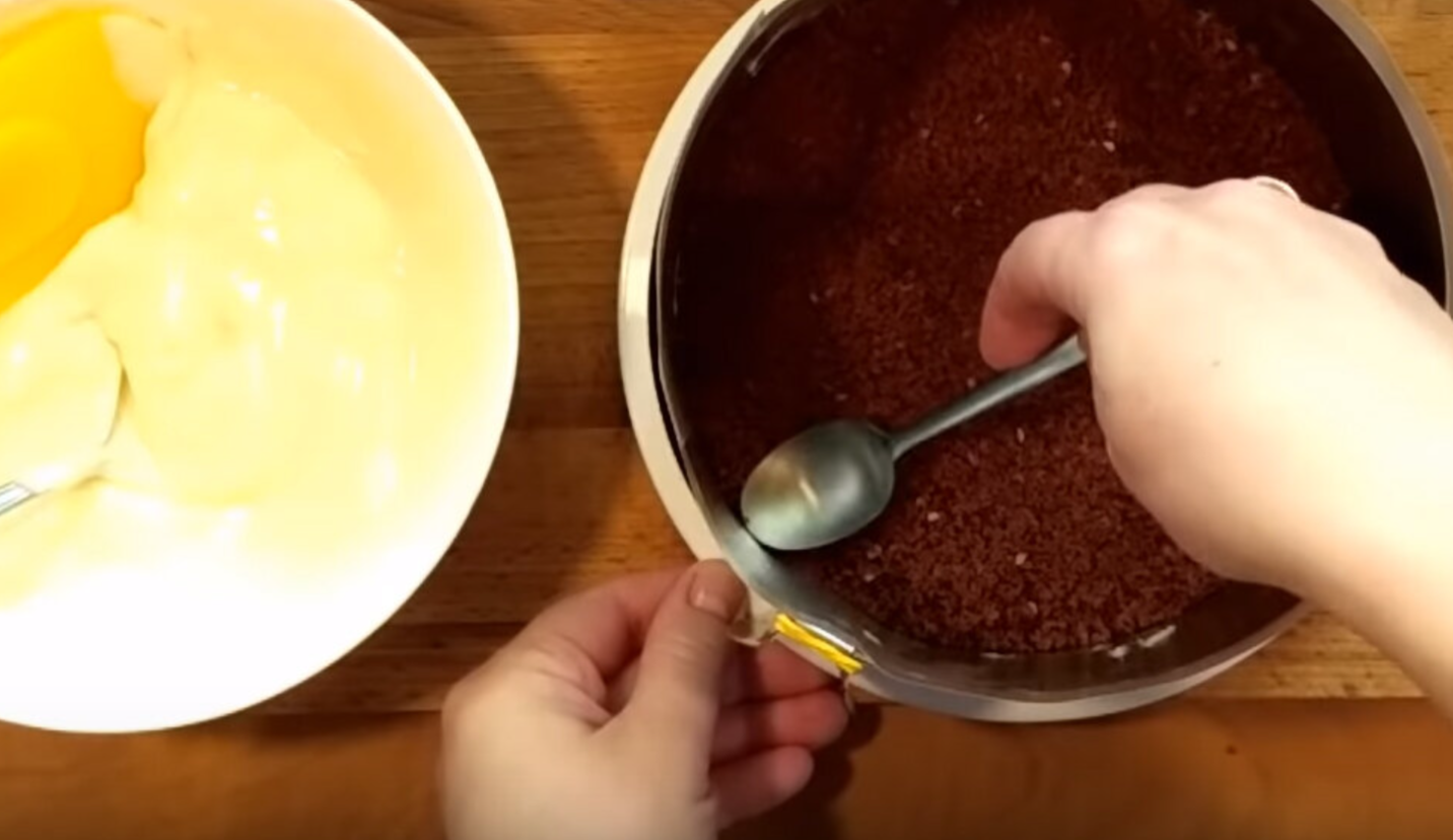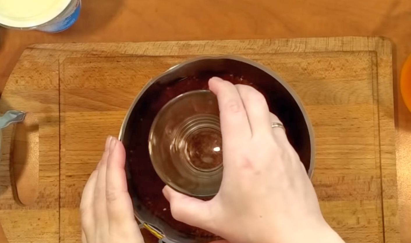 Викладаю частину крихти шаром 1 см, притискаю дном склянки.