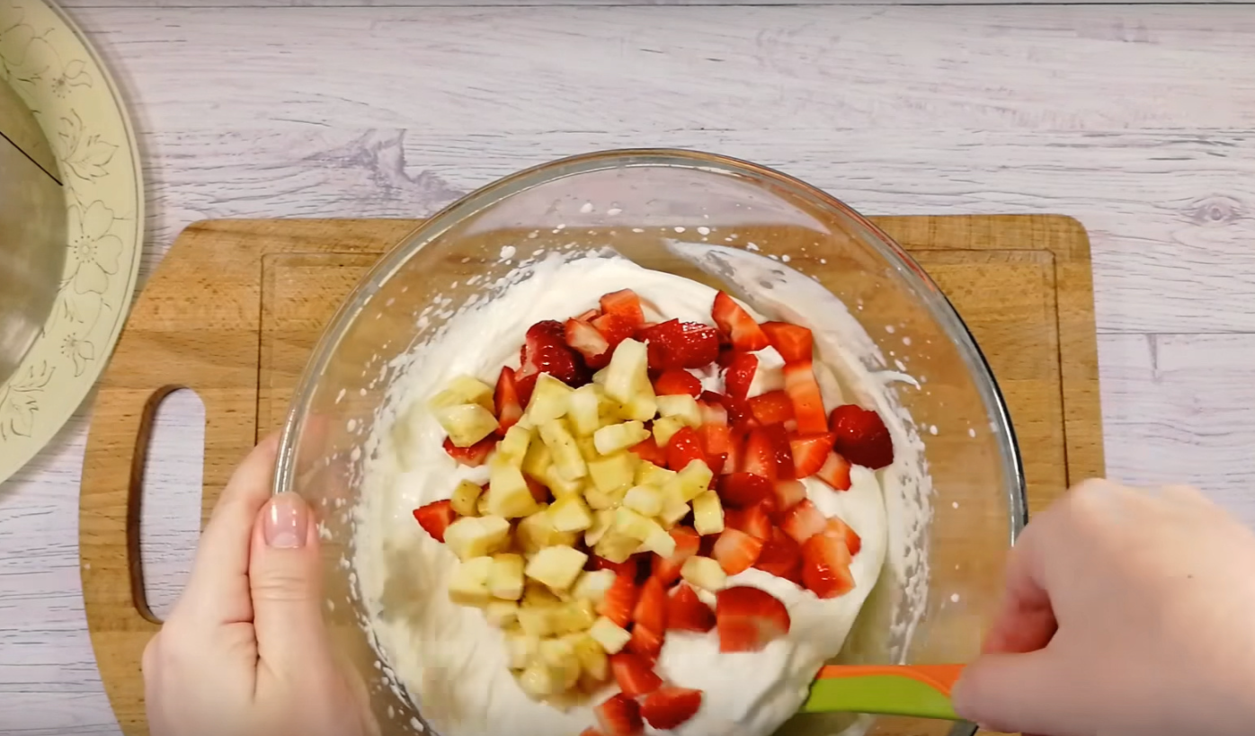 9. Додаю нарізані ягоди і фрукти, перемішую лопаткою.