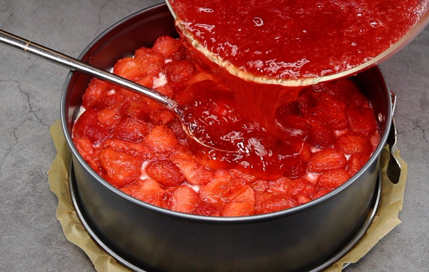Вистиглий корж злегка просочіть полуничним соком, викладіть сир, полуницю, залийте желе.