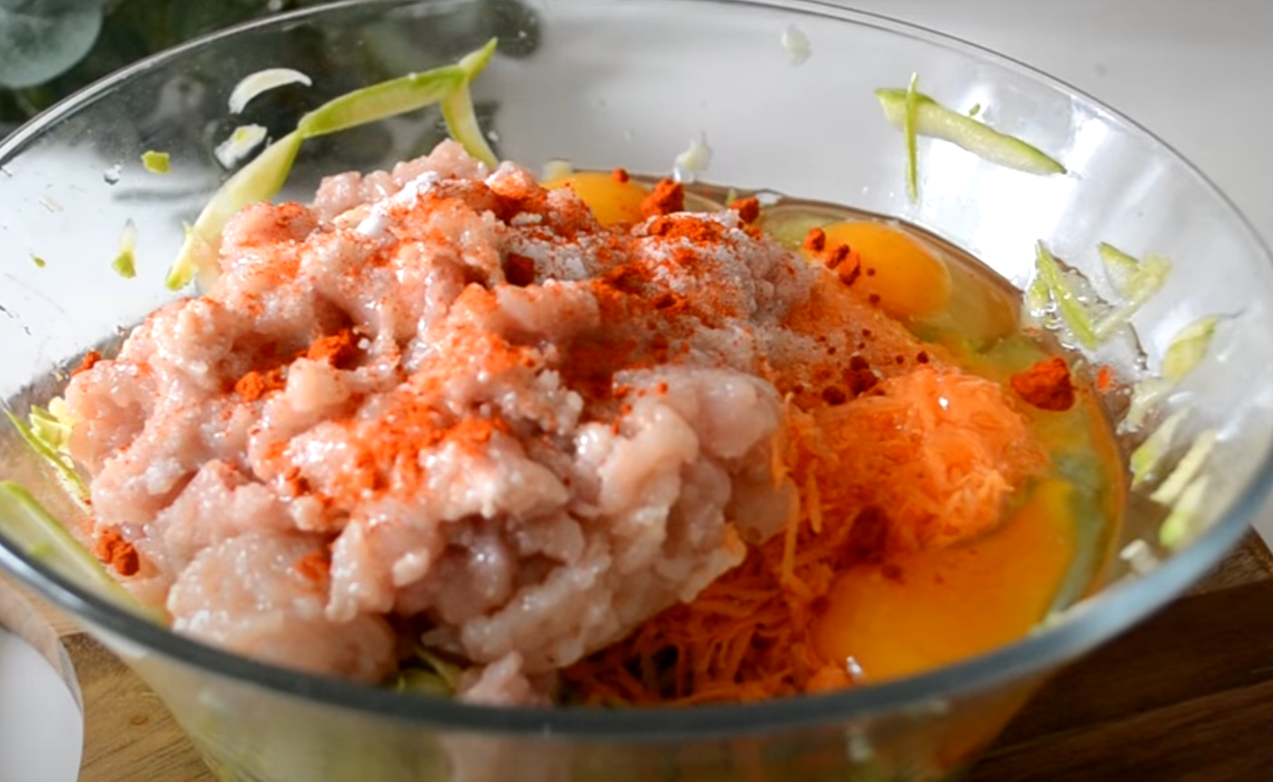 До кабачків додайте натерту моркву та курячий фарш.