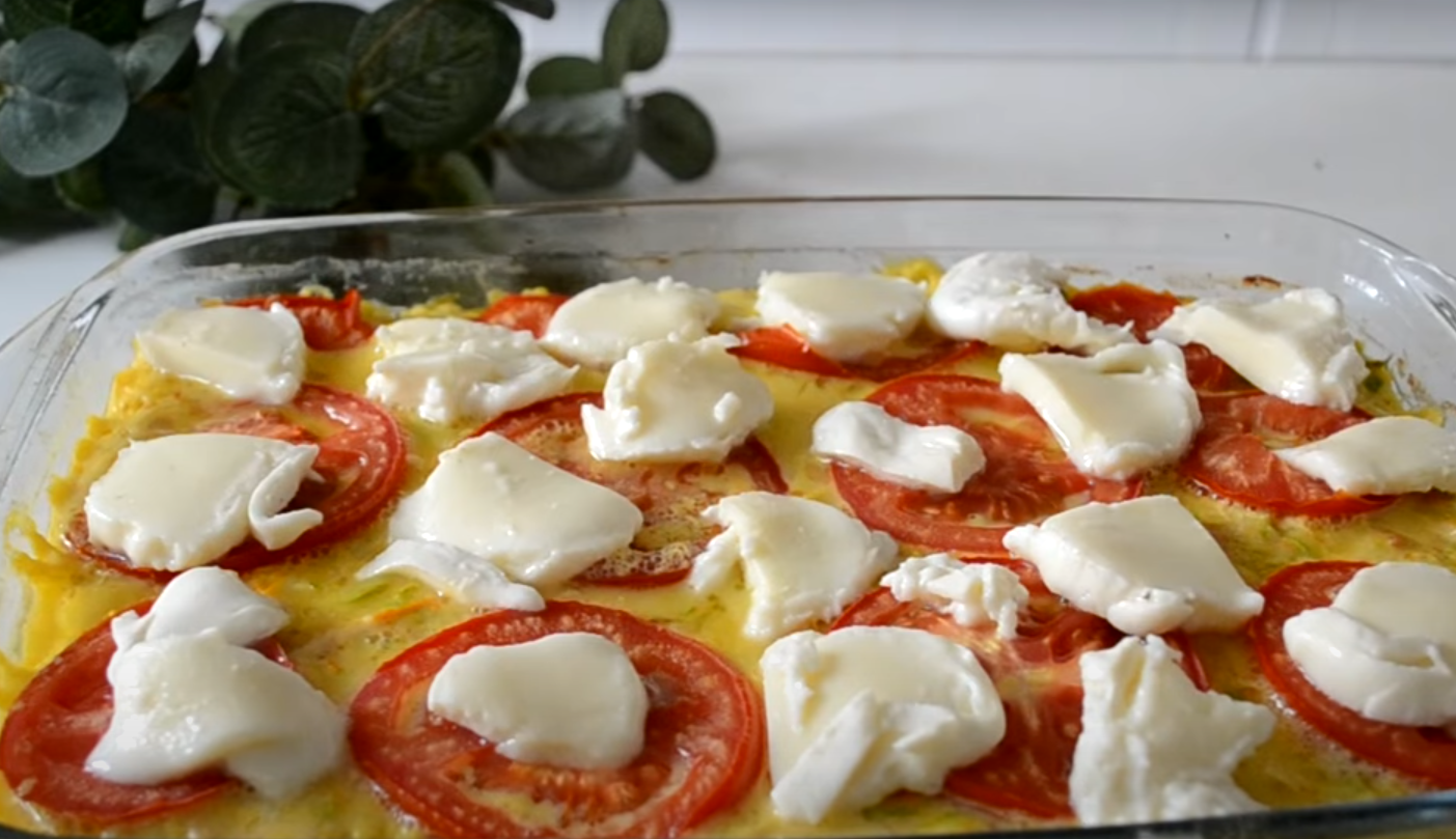 За 10 хвилин до кінця дістаньте запіканку, посипте тертою моцарелою або викладіть шматочки зверху