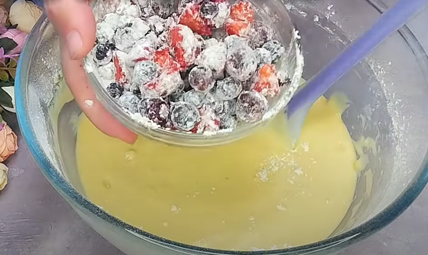 4. Ягоди обваляйте у ложці борошна, щоб не осідали на дно, і додайте до тіста