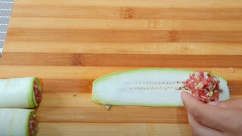 Викладайте трохи фаршу на край кожної скибочки кабачка й акуратно загортайте в рулетик. Фіксувати нічим не потрібно — тримають форму самостійно.