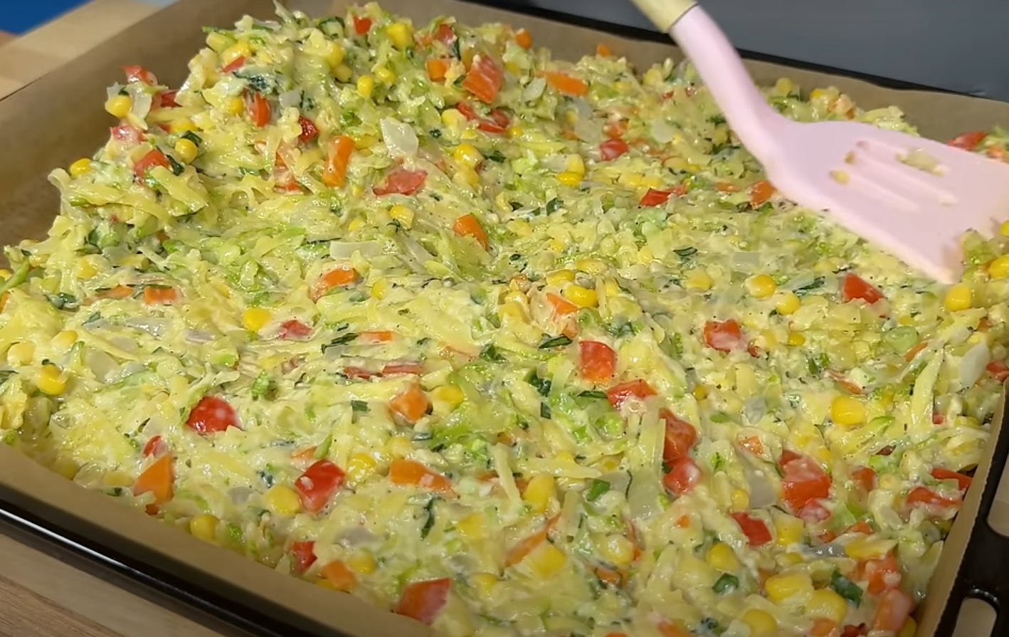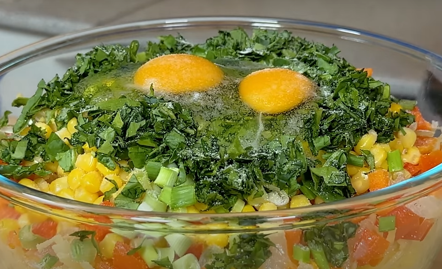 Змішайте овочі з кукурудзою, віджатими кабачками й картоплею, петрушкою та яйцями.