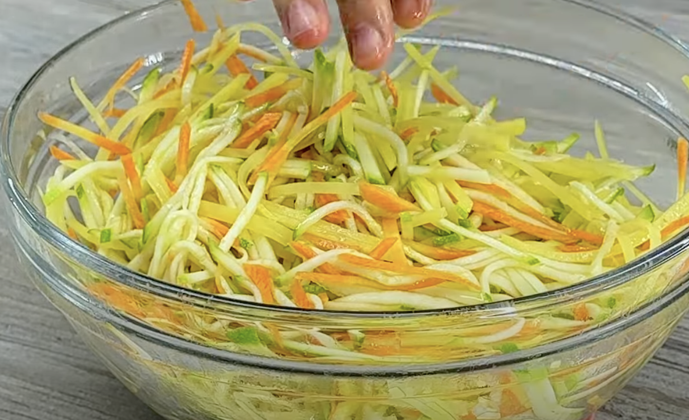 Натерти всі овочі на крупній тертці або на тертці для корейської моркви, трохи підсолити й залишити, щоб стекла зайва рідина.