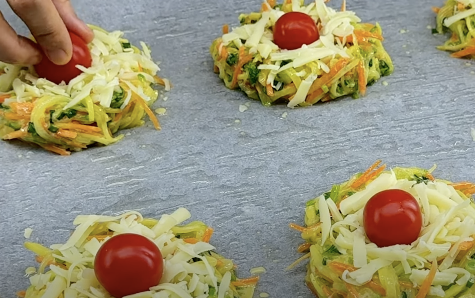Сформувати невеличкі гніздечка й викласти їх у змащену форму для запікання.
