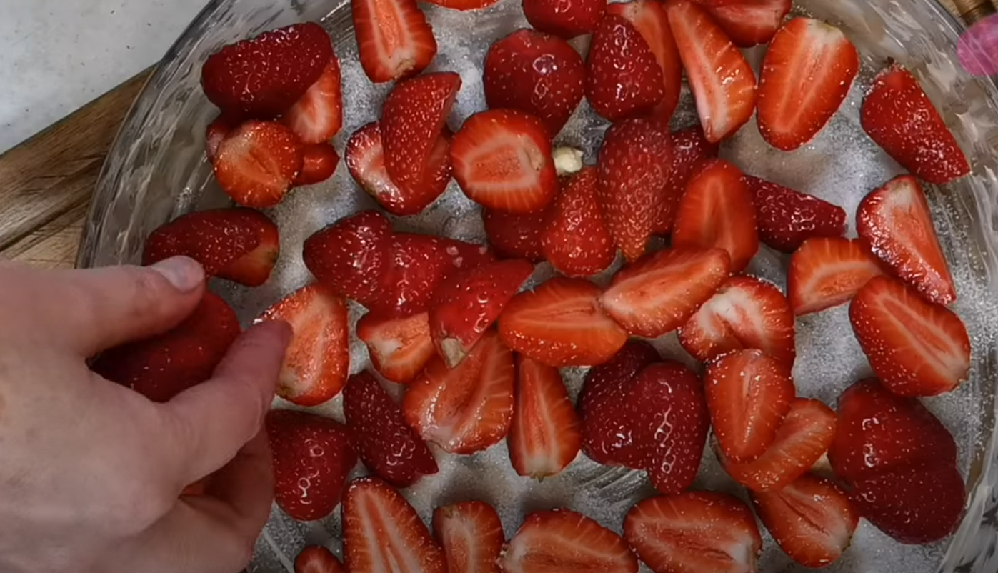 4. Змастіть форму вершковим маслом, посипте цукром і викладіть нарізану полуницю.