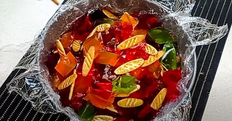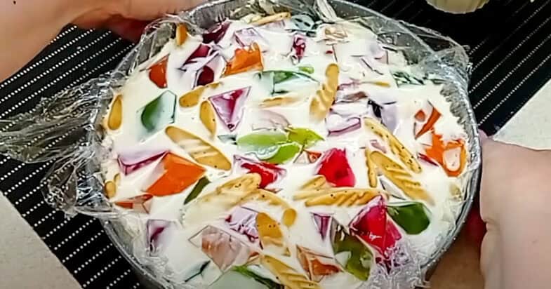 Розводжу в окремих мисочках кожне желе кип’яченою водою, ставлю в холодильник для повного застигання. Тоді нарізаю кубиками, застеляю роз’ємну форму діаметром 21 см. харчовою плівкою, викладаю усе желе і зверху печиво.