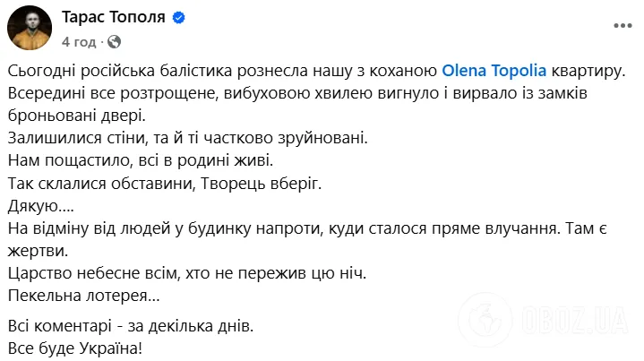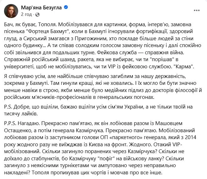 Бачиш, як буває, Тополя. Мобілізувався для картинки, форма, інтерв’ю, замовна пісенька «Фортеця Бахмут», коли у Бахмуті ігнорували фортифікації, здоровий глузд, а Сирський змагався з Пригожиним, хто покладе більше людей за стіни одного будинку, – написала вона. — А ти співав солодким голосом замовну пісеньку і далі спокійно собі звільнився для подальших турне. Фейкова служба – справжня війна. Справжній російський шахед, ракета, яка не обирає, чи «вирішував» ти в університеті, щоб не мобілізували, чи ти VIP із фейковою службою. «Карма».
