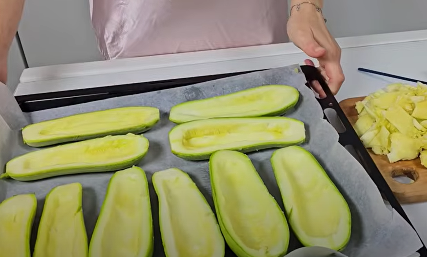 Кабачки розрізаю вздовж і виймаю м’якоть, формуючи човники. Змащую олією, солю, перчу й відправляю в духовку на 15-20 хвилин при 180°C до м’якості.