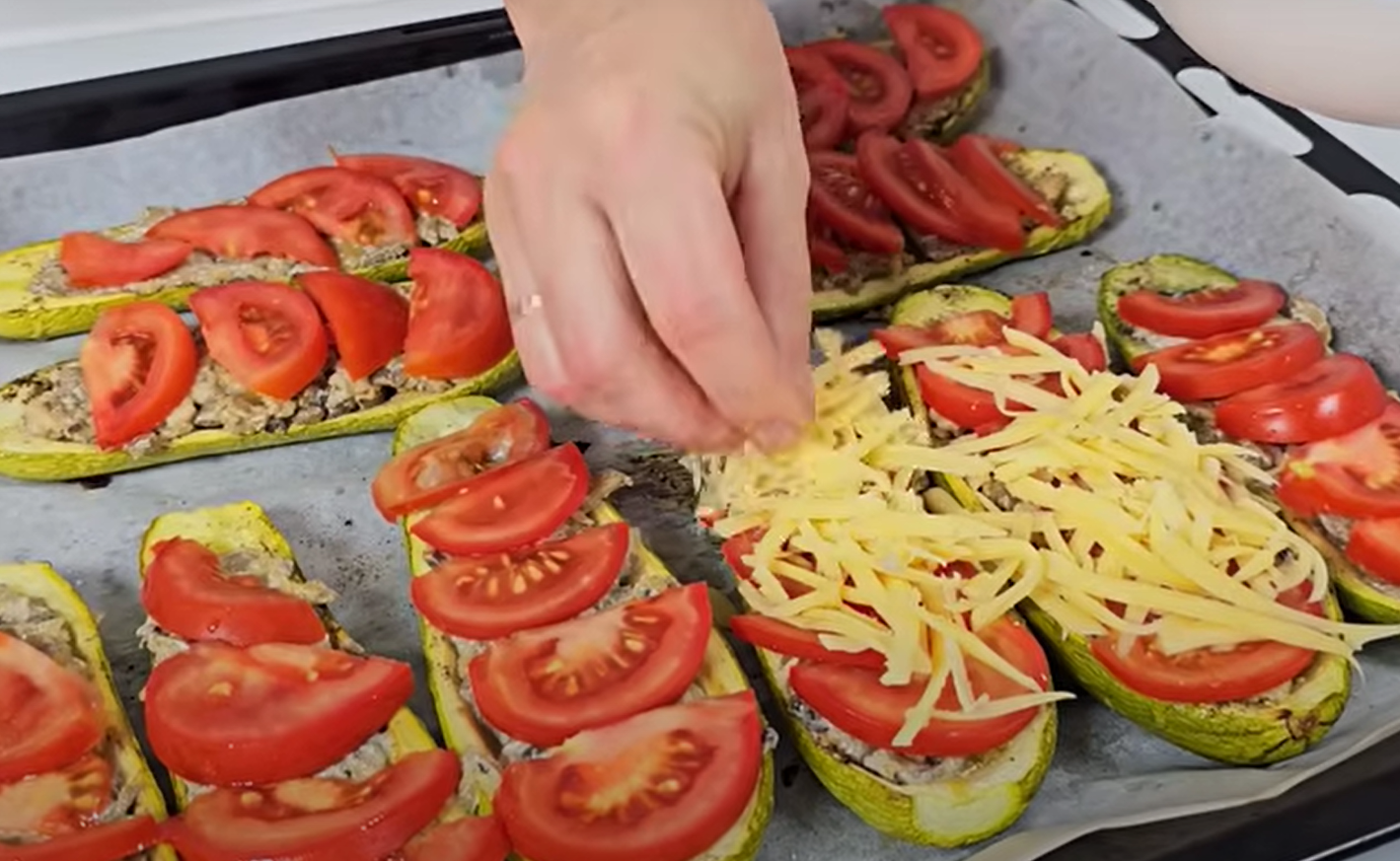 Наповнюю човники обома начинками, прикрашаю помідорами, посипаю сиром. Запікаю ще 7-10 хвилин, поки сир не стане золотистим.