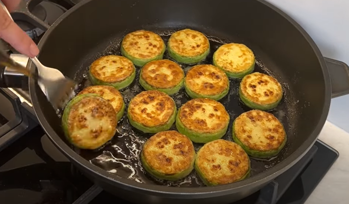Кабачки ріжу кружальцями завтовшки близько 1 см. Присолюю та приперчую, залишаю на 10 хвилин. Обкачую в борошні й обсмажую на сковороді до рум’яної скоринки з обох боків. Викладаю на паперові рушники, щоб прибрати надлишок олії.