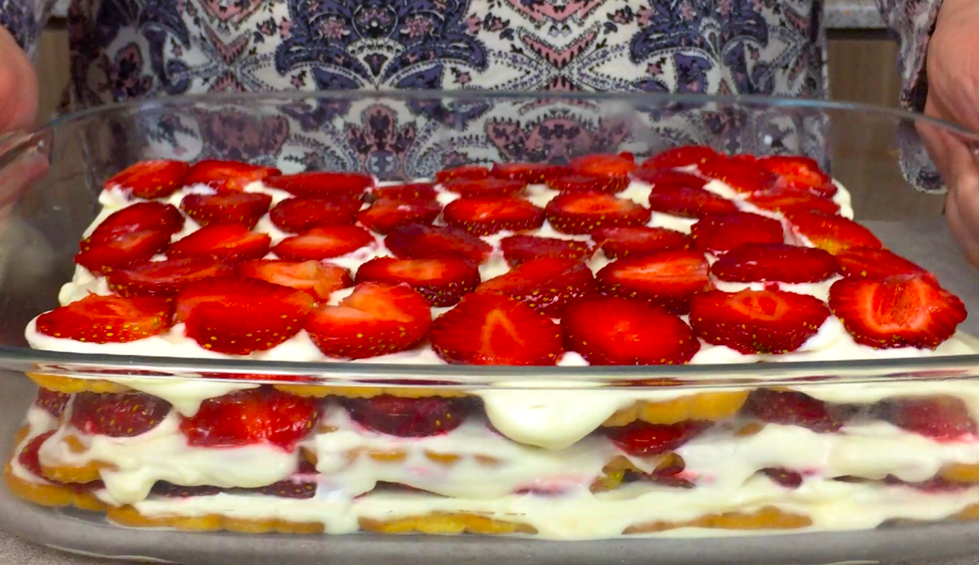 У форму кладу трохи крему, далі шар печива, змащую кремом, викладаю полуницю. Знову печиво, крем і полуниця.