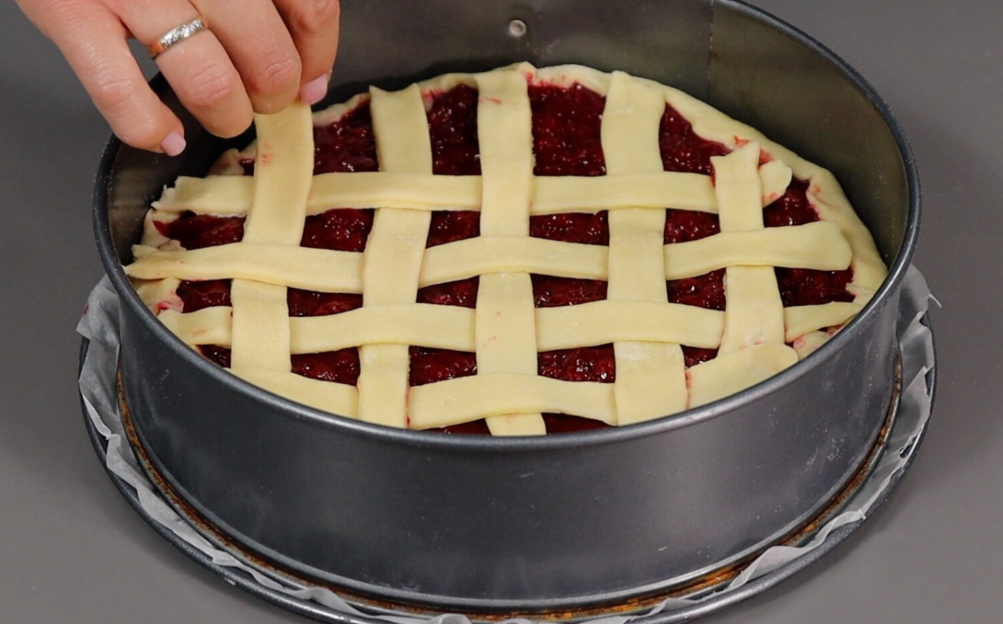 З верхньої частини робимо решітку.5️⃣ Даємо пирогу підійти 20 хвилин, змащуємо жовтком з молоком. Випікаємо при 180 °С 30 хвилин.6️⃣ Остиглий пиріг посипаємо цукровою пудрою.