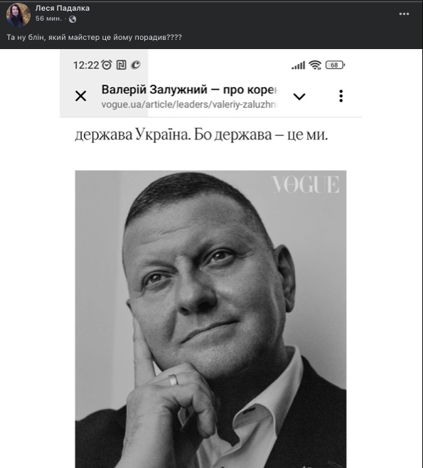 Користувачі почали порівнювати фото Валерія Залужного тих часів, коли він був Головнокомандувачем Збройних Сил, та у журналі Vogue. Частина українців у соцмережах вважає, що фотосесія для Vogue недоречна на тлі загострення бойових дій, адже для багатьох військових і громадян такі глянцеві образи можуть виглядати відірваними від реальності війни.