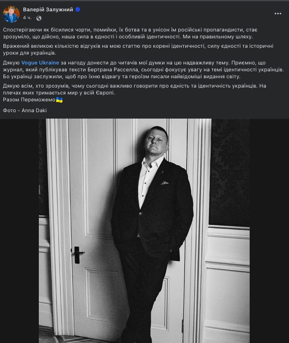 Колишній головнокомандувач ЗСУ та чинний посол України у Великій Британії Валерій Залужний здивував публіку, з’явившись на сторінках українського видання Vogue.