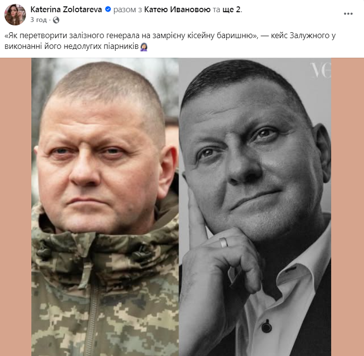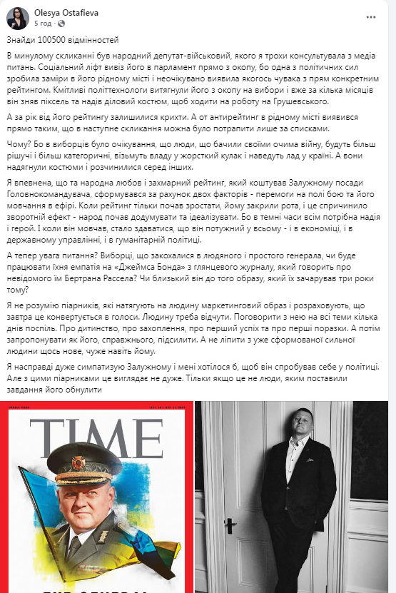 Олеся Остафієва, порівнявши нові фото з архівними знімками Залужного 2022 року, зазначила: «Знайди 100500 відмінностей… Коли рейтинг тільки почав зростати, йому закрили рота, і це спричинило зворотній ефект – народ почав додумувати та ідеалізувати. Бо в темні часи всім потрібна надія і герой… Я не розумію піарників, які натягують на людину маркетинговий образ і розраховують, що завтра це конвертується в голоси».