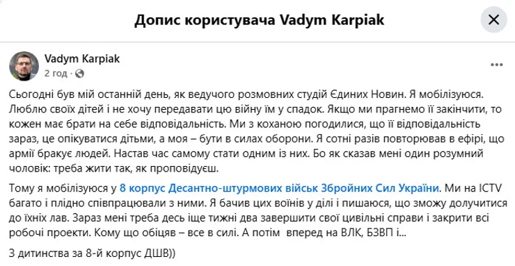 «А зараз коротке, фактично персональне оголошення. Я трошки хвилююся, це правда. Річ у тому, що це були останні мої розмови в розмовній студії „Єдиних новин“. Я вирішив мобілізуватися», — заявив Карп’як, додавши, що з 2022 року мріяв оголосити в ефірі про перемогу України. «Її треба якось наближати в лавах, очевидно, Сил оборони. Тому я дозрів до того, щоб мобілізуватися. Я сподіваюся служити у восьмому корпусі Десантно-штурмових військ. Туди збираюся мобілізуватися», — пояснив він, наголосивши, що не може просто чекати перемоги.