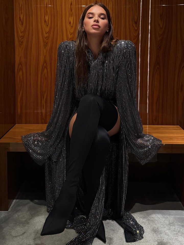 Доповнили образ ботфорти на підборах, які додають висоти та драматичності, а також мінімалістичні прикраси – тонкі сережки та кільця, що не відволікають увагу від головного.