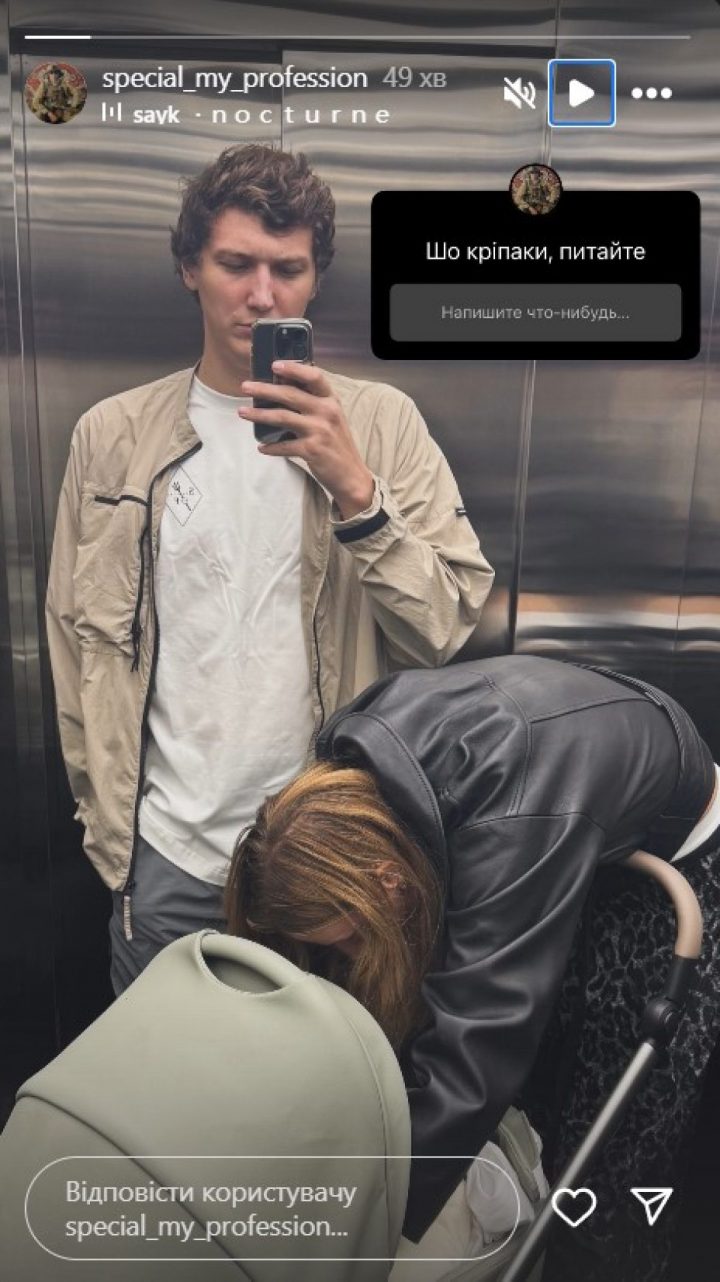 Нещодавно в Instagram-сторіс Дмитра з’явилося особливе фото – спонтанне селфі, зроблене в дзеркалі ліфта. На знімку він упевнено позує, а Леся, ніжно схилившись над візочком, піклується про їхнього чотиримісячного сина.