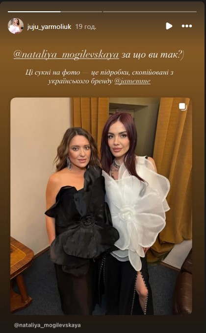 У своїх Instagram Stories Ярмолюк оприлюднила фото, де співачки позують у сукнях із характерною великою квіткою на животі — візитівкою бренду J’amemme.