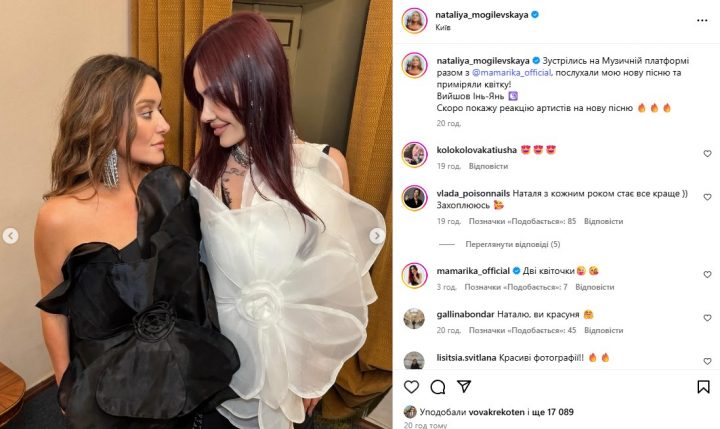 Сама Могилевська поки що зберігає мовчання і не відповідає на звинувачення. Натомість у своєму Instagram вона нещодавно поділилася радісною новиною про зустріч із MamaRika на Музичній платформі, де вони разом приміряли образи з квітковим акцентом.