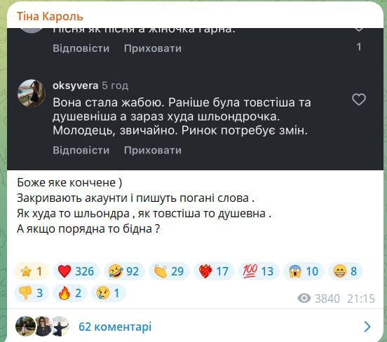 Коментар був написаний із закритого акаунта, що не залишилося поза увагою артистки. Тіна не проігнорувала образу — вона скопіювала цей допис і оприлюднила у своєму Telegram-каналі, додавши іронічну відповідь: