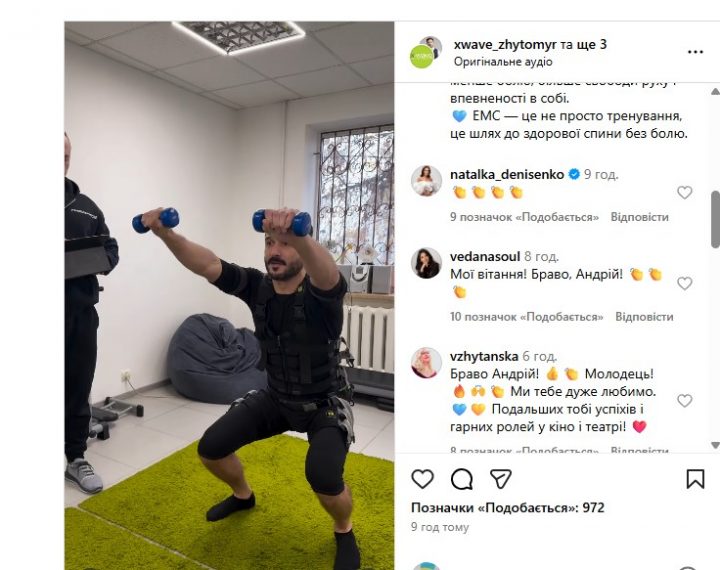 У своєму Instagram артист поділився кадрами з тренувань і розповів, що відновлюється після складної операції на спині. Звичайні фізичні вправи йому зараз заборонені, тому він обрав сучасний метод — EMS-тренування, які стимулюють м’язи безпечними електроімпульсами.