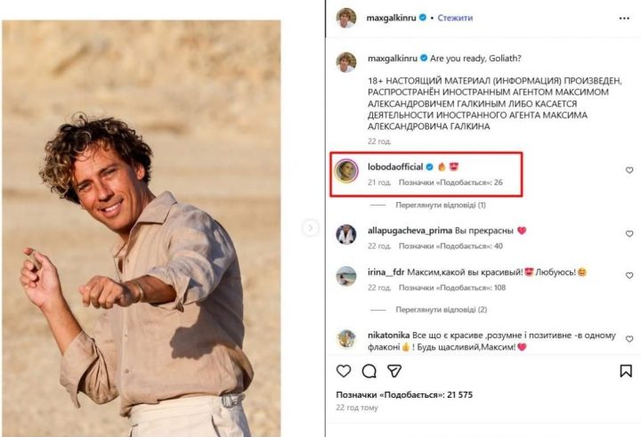 Цей пост зібрав тисячі лайків. Серед перших коментаторів — українська співачка Світлана Лобода, яка, як і Галкін, покинула Росію після початку повномасштабної війни в 2022 році. Лобода залишила емодзі вогню та личко з очима-сердечками — символічний жест підтримки, що викликав хвилю обговорень.