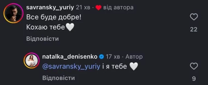 Особливу увагу підписників привернув коментар Юрія Савранського під цим дописом. Манекенник коротко, але щиро написав: «Все буде добре! Кохаю тебе!». Денисенко відповіла взаємністю, фактично поставивши крапку в усіх припущеннях щодо їхніх стосунків. Так пара відкрито підтвердила: між ними — не просто дружба, а справжні почуття.
