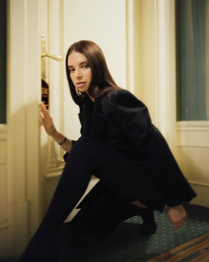 Для виходу Катя обрала ефектну чорну сукню-піджак із витонченим вирізом у зоні декольте, доповнивши образ взуттям на підборах, що плавно переходило в лосини. Її лук підкреслив стрункі ноги й додав образу сміливої елегантності. 38-річний Олександр виглядав стримано й стильно в темно-синій сорочці та класичних брюках.