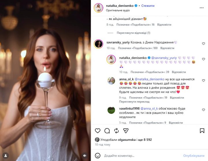 Не залишився осторонь і коханий акторки — манекенник Юрій Савранський. У день народження Наталки він публічно звернувся до неї з ніжним привітанням, назвавши її «коханою». Денисенко у відповідь залишила під дописом низку білих сердець — без зайвих слів, але з очевидними почуттями.