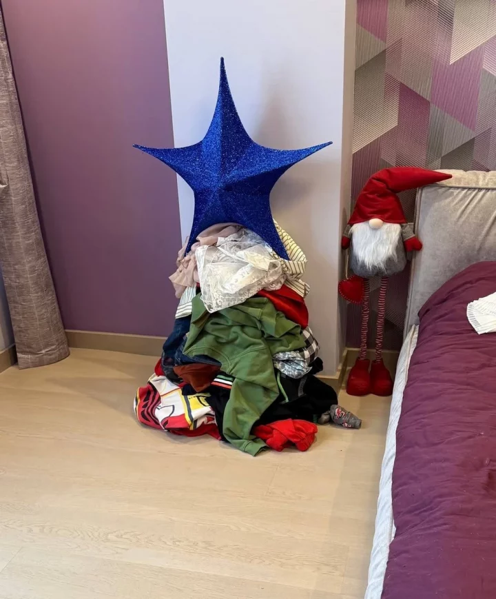 Замість традиційного дерева Лебідь спорудила імпровізовану “лакшері-ялинку” з одягу, доповнивши її зіркою. Результат вийшов настільки стильним і кумедним, що підписники оцінили ідею на всі сто.