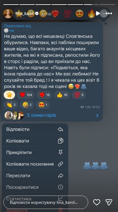 Втім, Тіна Кароль не залишила ці слова без відповіді. Вона опублікувала скриншот допису Беспалова в Instagram та різко висловилася щодо його діяльності. Співачка звинуватила блогера в медіа-кілерстві та маніпуляціях, наголосивши, що реальна реакція жителів Слов’янська була зовсім іншою.