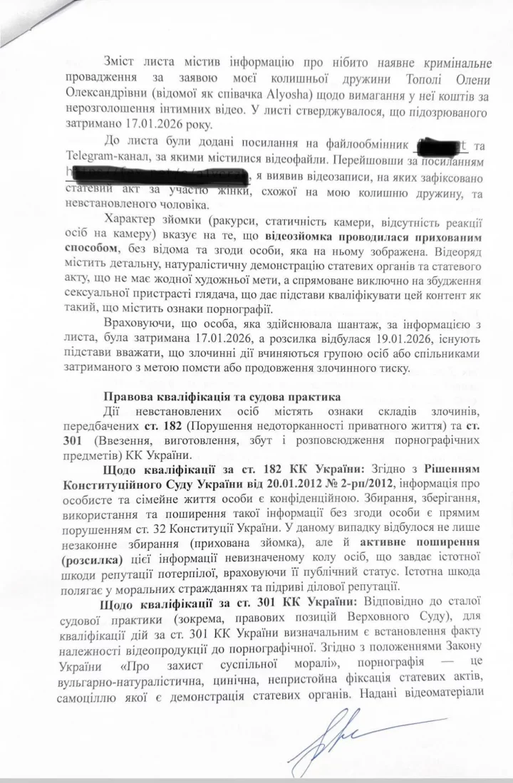Затриманий 23-річний киянин уже перебуває під слідством, йому оголошено підозру за ч. 4 ст. 189 ККУ (вимагання), що загрожує до 12 років ув’язнення. Тополя чітко дав зрозуміти: ця тема для нього закрита, і він не планує більше її коментувати.