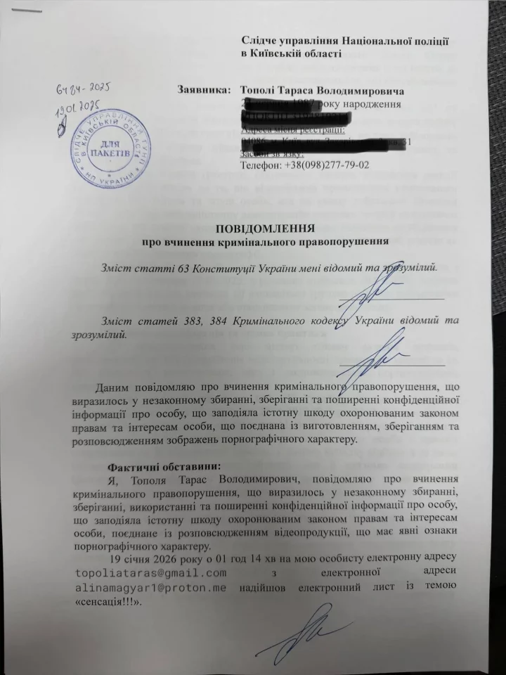 19 січня Тарас подав заяву до поліції про факт розповсюдження матеріалів порнографічного характеру, які надійшли йому на пошту. Він додав фото заяви й попросив долучити її та його покази до основної справи проти шантажиста.