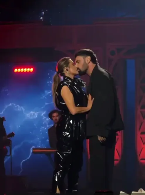 Виконавець скористався нагодою і ще раз поцілував колегу — цього разу дружньо в щоку. До того ж він подарував їй букет червоних троянд та поділився зворушливим спогадом.
