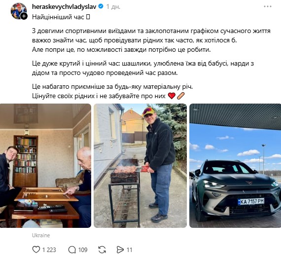 Скелетоніст Владислав Гераскевич, якого МОК не допустив до Зимових Олімпійських ігор-2026 через шеврони з фото загиблих українських спортсменів на шоломі, опублікував у соцмережах фото сімейного відпочинку. У підписі він написав про цінність часу з рідними: шашлики, нарди з дідом, улюблена їжа від бабусі.