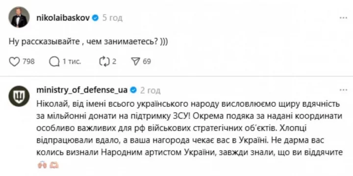 «Ніколай, від імені всього українського народу висловлюємо щиру подяку за мільйонні донати на підтримку ЗСУ! Окрема подяка за надані координати особливо важливих для РФ військових стратегічних об’єктів. Хлопці відпрацювали вдало, а ваша нагорода чекає на вас в Україні. Недарма вас колись визнали народним артистом України, завжди знали, що ви віддячите».
