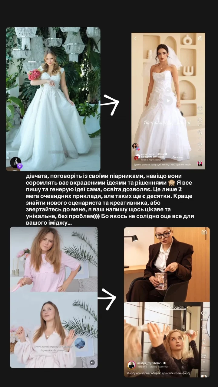 Акторка навела конкретні приклади. Зокрема, реклама засобів для волосся, яка практично повторює її попередній ролик, а також відео у весільному стилі, що з’явилося невдовзі після її публікації з подібною концепцією.