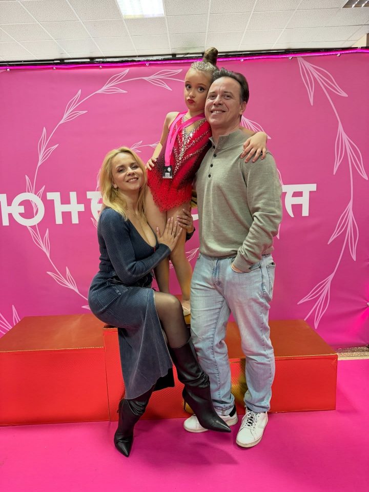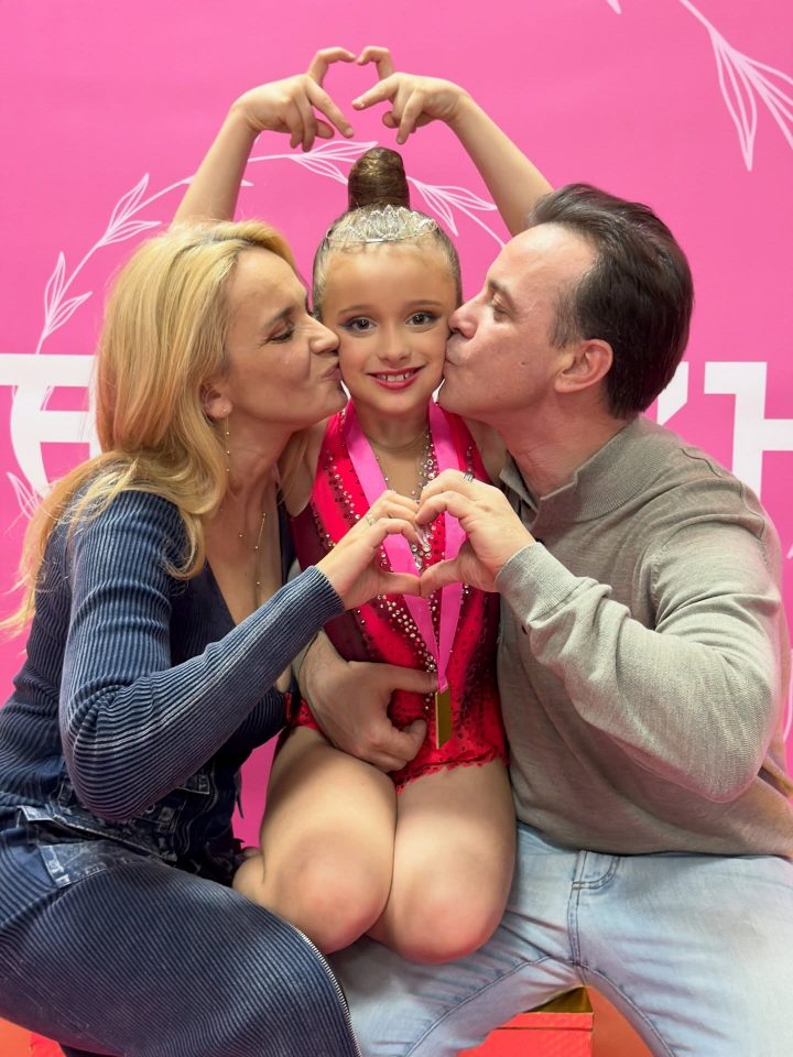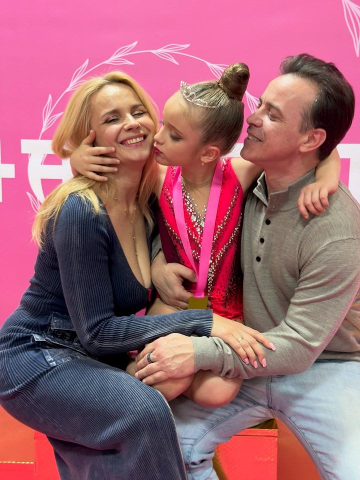 На світлинах — усміхнена Поліна на п’єдесталі разом із не менш щасливими батьками, які не приховують гордості за доньку.