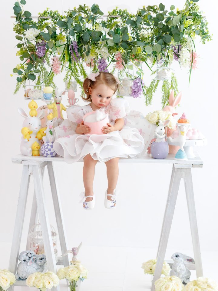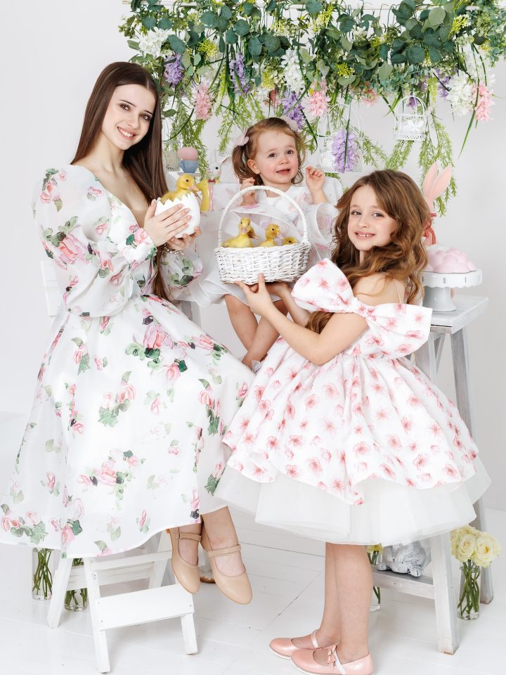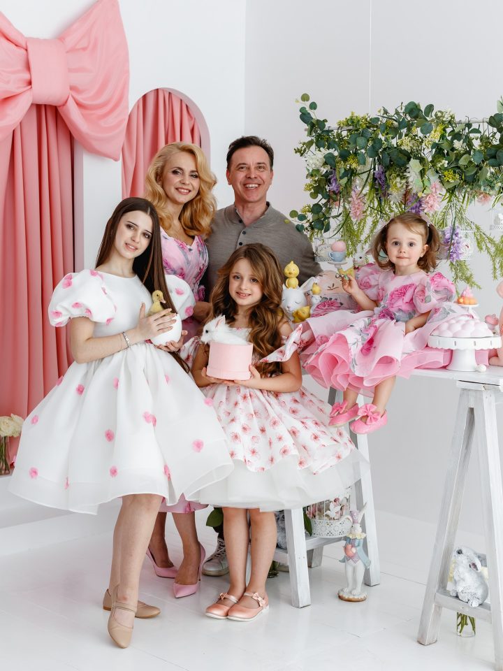Середня донька, 7-річна Поліна, перевтілилася у справжню принцесу — у пишній сукні з бантами та квітковим принтом. Для фотосесії їй зробили великі локони, а позувала вона разом із милим кроликом.