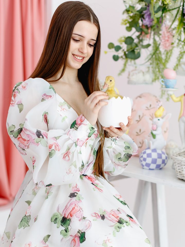 На знімках 13-річна Діана постала в ніжній білій сукні з акварельними квітами, тримаючи в руках маленьке каченя. Образ доповнили рукави-ліхтарики та витончений V-подібний виріз, що додали легкості й святкового настрою.