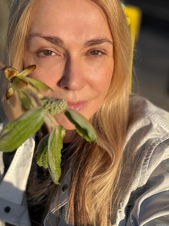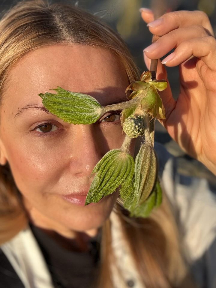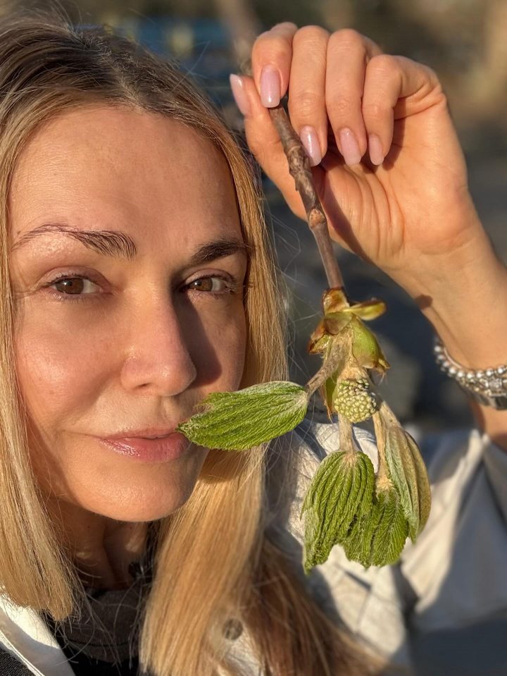 Артистка показалася без макіяжу — природна, усміхнена та натхненна. На фото вона позує поруч із гілкою каштана, на якій вже з’явилися ніжні зелені листочки та перші бутони.