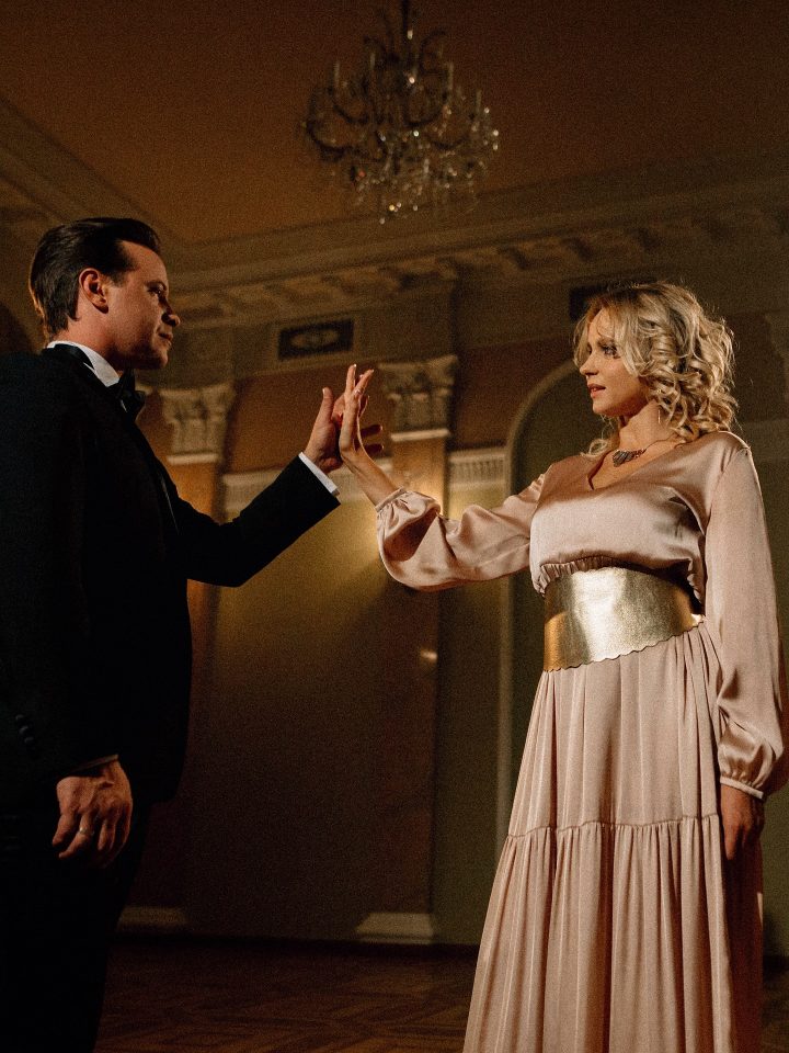 На фото подружжя постає у святкових образах: вона — у витонченій сукні, він — у класичному костюмі. Вони танцюють, ніби знову проживають свою історію кохання, яка триває вже багато років. Атмосфера знімків наповнена теплом, гармонією та щирою близькістю. Автором світлин став фотограф Андрій Галінський, який свого часу зафіксував ці особливі моменти.