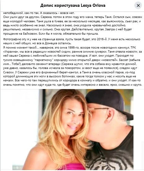 «Сергій був дуже живий, і якось досі незрозуміло, що його насправді більше немає. І Таня була дуже жива — і тепер також незрозуміло. Вона здавалася невразливою, непереможною. А виявилося — зовсім ні. Вони пішли одне за одним. Сергій, потім його мама, тепер Таня. Залишився син, ще зовсім молодий. Таня пішла в Києві. Її за кілька місяців, як з’ясувалося, „з’їв“ рак, адже ніхто особливо не знав. Наскільки я знаю, вона йшла надзвичайно гідно, рішуче, незалежно та сильно. Вона крута», — написала Орлова.